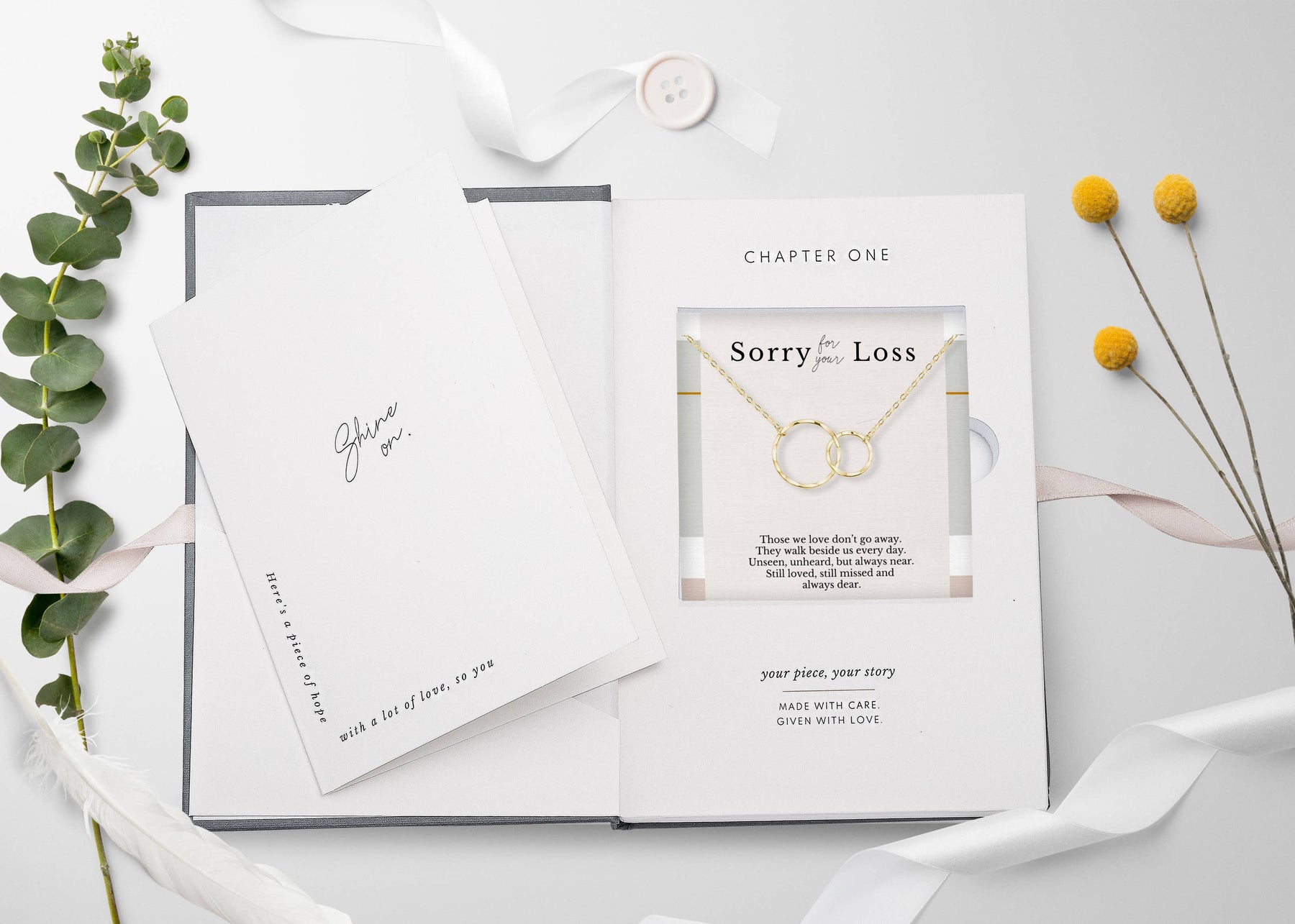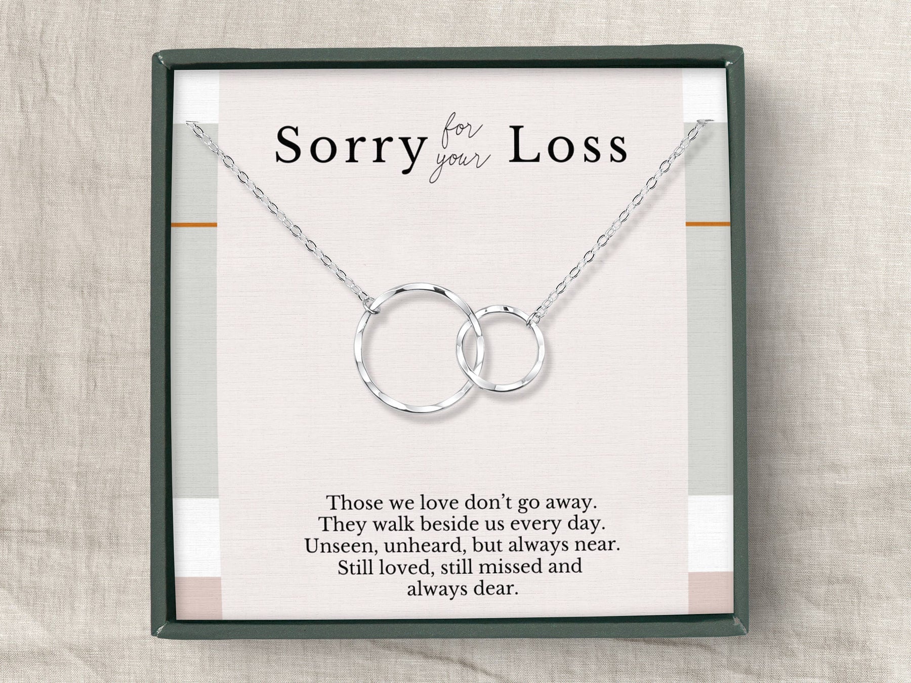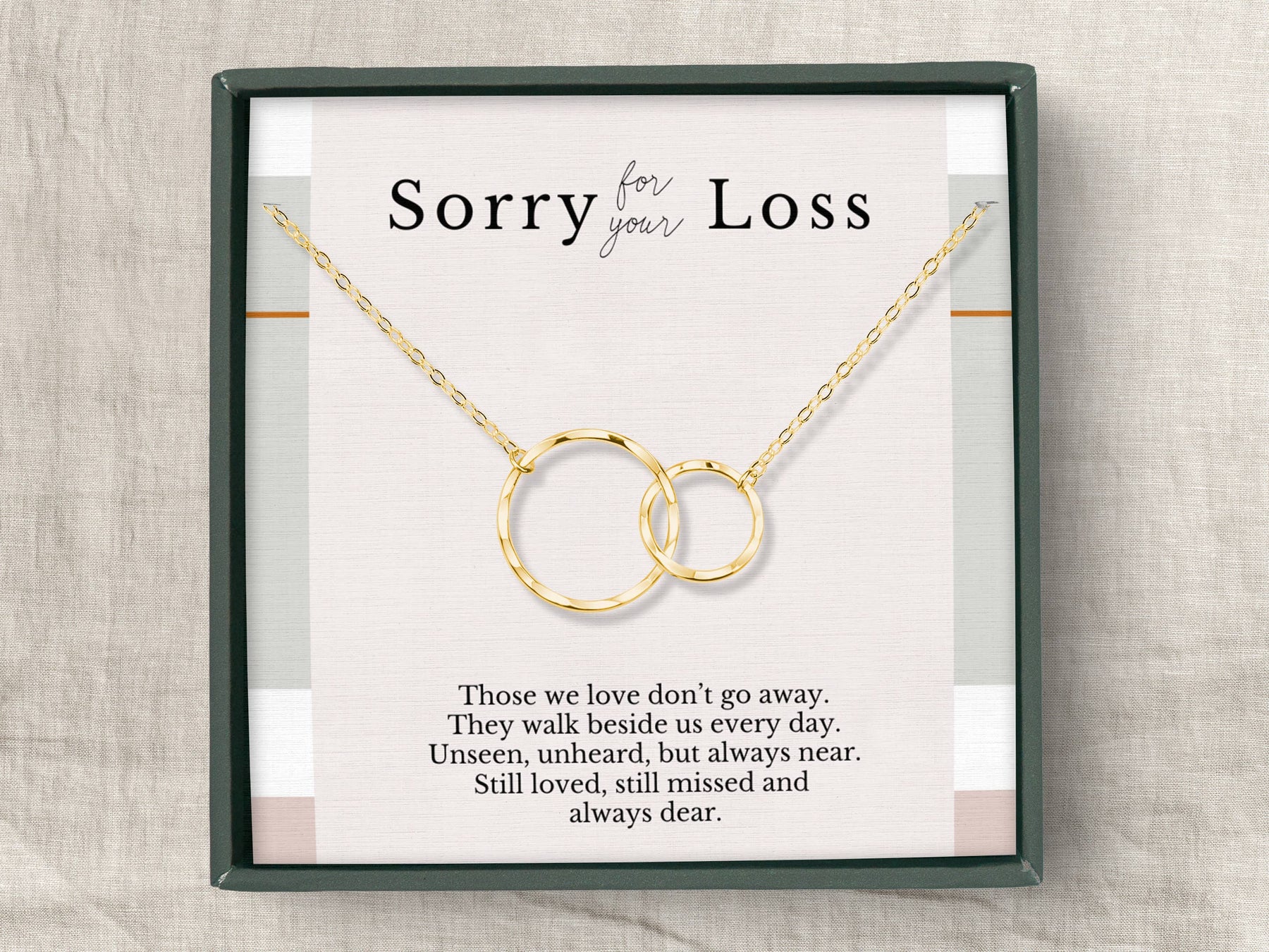 It is so hard to watch someone you love go through a devastating loss. Grief is horrible, but sometimes thoughtful gestures can go a long way in helping the person you care about feel just a little better - even if just for a moment. This necklace comes with a meaningful message so you can let her know you are thinking about her during these hard times. ***The Broken Chain by Ron Tranmer, COPYRIGHTED. unlawful to reproduce without authorization*** - All components are handmade with: 14K gold vermeil & sterling silver. - Each pendant is textured by hand, creating a uniquely beautiful hammered finish that reflects light and sparkles with each movement. Every pendant has its own distinctive texture, no two are the same. - Necklace is 18” long with adjustable ring at 16”. - Pendant measures 1" in width and 0.65" in height. - Beautifully packaged in our custom designed jewelry box with a blank greeting card and jewelry care instructions.