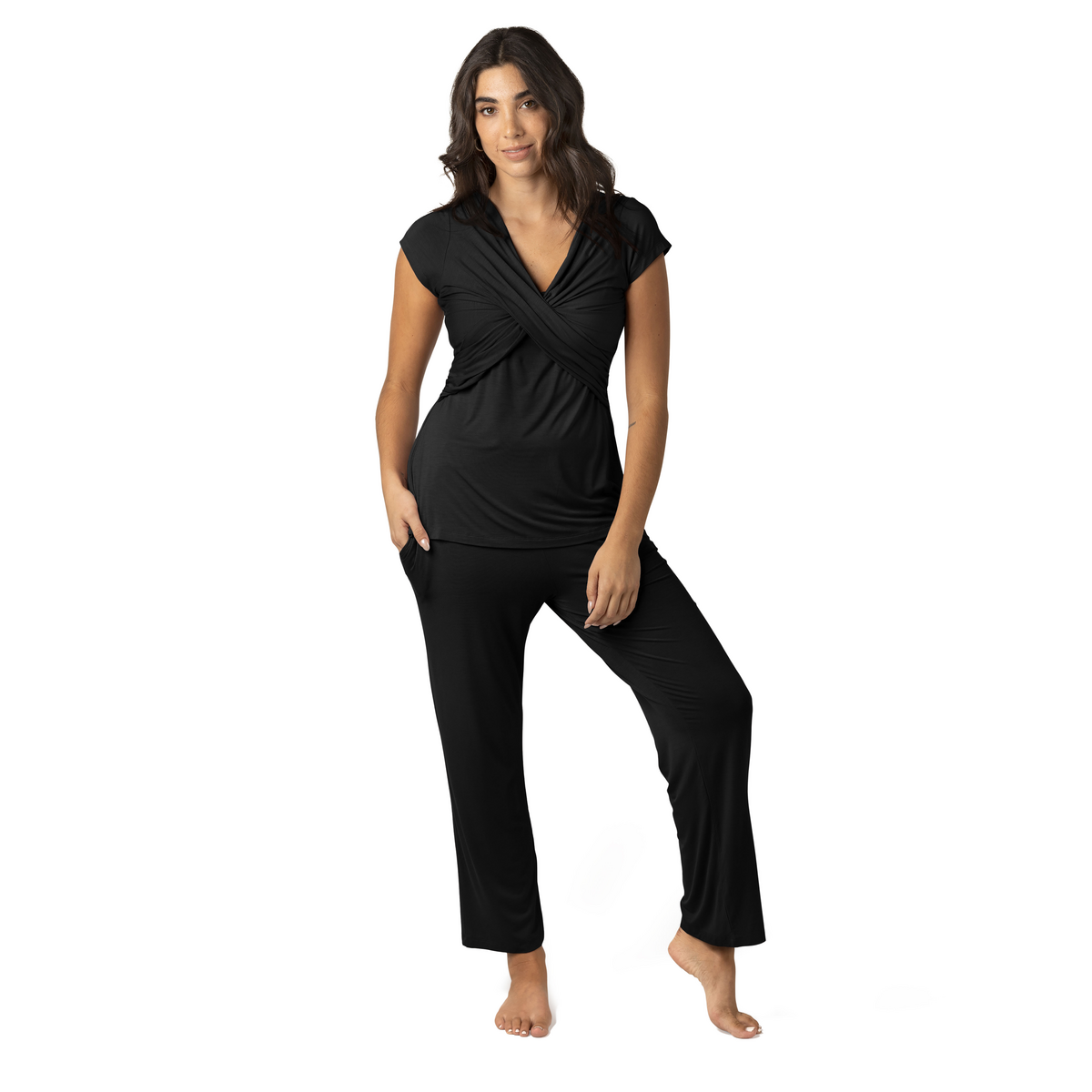 Designed with comfort, style and function in mind. Once you feel the softness of this maternity pajama set, you will reach for them time after time to get through those long nights of nursing, working-from-home days and stay-in-your-pajamas days! Be sure to pack them in your hospital bag. These also make a perfect baby shower gift! The two-layer top design is stretchy enough to simply pull down for night feedings, or you have the option to split the two layers and nurse more discreetly when company is around. These maternity pajamas also have the added comfort of no elastic bands going all the way around your chest. And they are made of lightweight viscose to keep you cool and comfortable. The super-comfortable pants have a wide, gentle waistband and convenient pockets. You don't have to be nursing to love these! The stylish ruched top adds a little modesty, and you won't feel like you must wear a bra if the company is around. Feel free to put the top on with jeans.