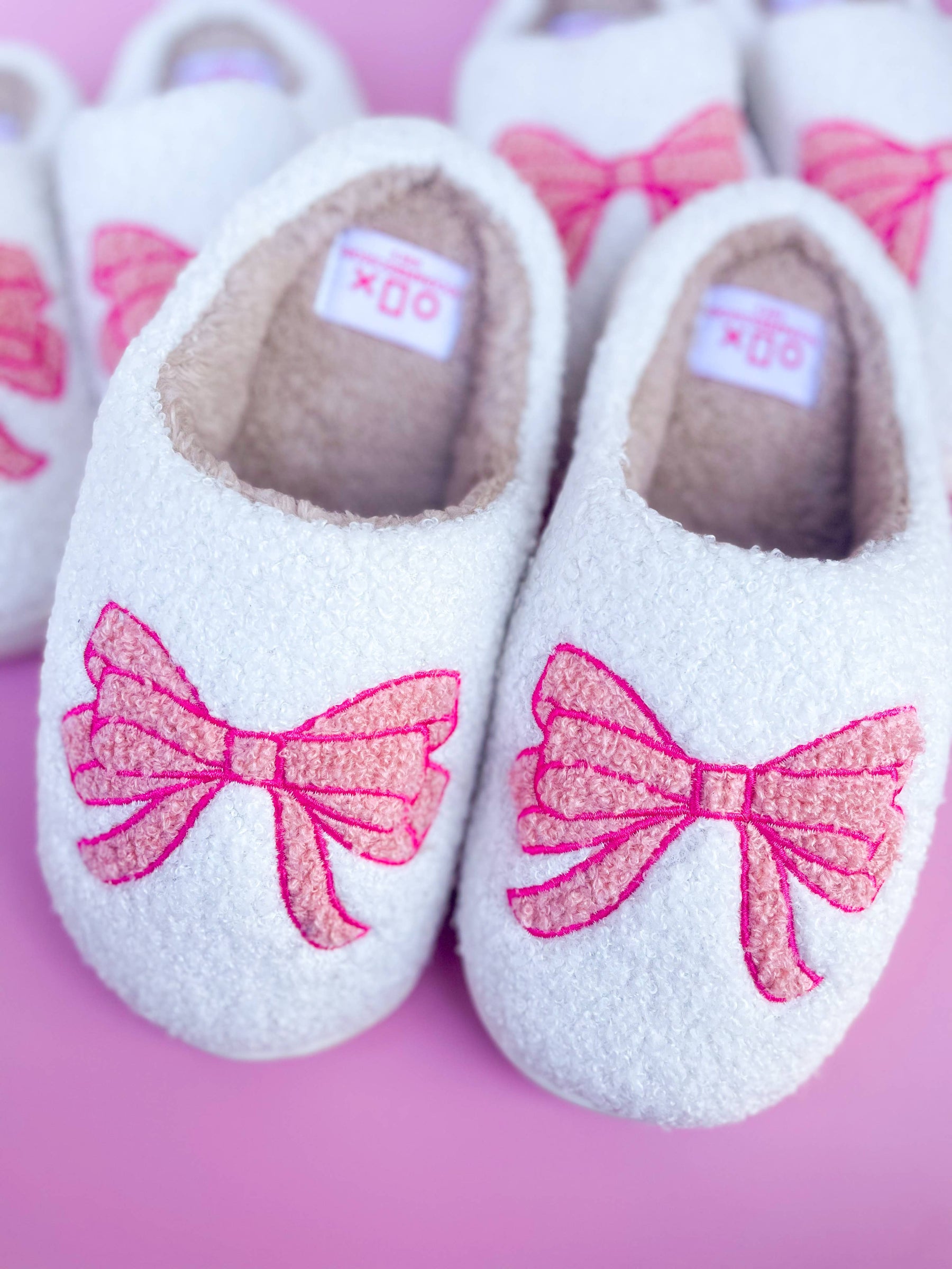 Blue Bow Slippers S: size 7, european 37/38 M: size 8, european 39/40 L: size 9, european 41/42 Xl: size 10, european 43/44 ***Sizes will be printed on tag attached in slipper. See photo of pink bow slipper.*** - Soft plush fabric and lining - Hard soles (light outdoor use) - Embroidered bow Pair them with one of our pajama sets to complete your loungewear look. Add our matching little kid / toddler slippers to complete the look for the whole family.